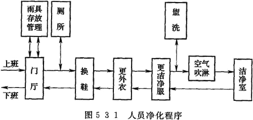 5.3.2 人員凈化用室,應根據換鞋(凈鞋)、更外衣、更潔凈工作服等的需要設置。雨具存放、廁所、盥洗室、淋浴室、休息室等生活用房和空氣吹淋室、氣閘室、潔凈工作服洗滌間及干燥間等其他用室,可根據需要設置。